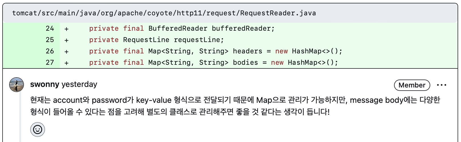 그래서 요청 메세지 바디를 관리하는 클래스를 하나 만들어 전체 내용을 읽은 String과 Content-Type을 받아 조건에 맞게 body를 생성하도록 했다. 다만 지금 미션의 요구사항엔 application/x-www-urlencoded 타입 외에 다른 타입은 다루지 않고 있는 것 같아서 확장성만 열어두고 pr를 보냈다.