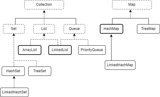 자바에서 "목록"과 "셋", "큐"는 Collection이라는 인터페이스를 구현하고 있다. 자바의 컬렉션과 관련된 클래스들을 하나의 그림으로 나타내면 다음과 같다.