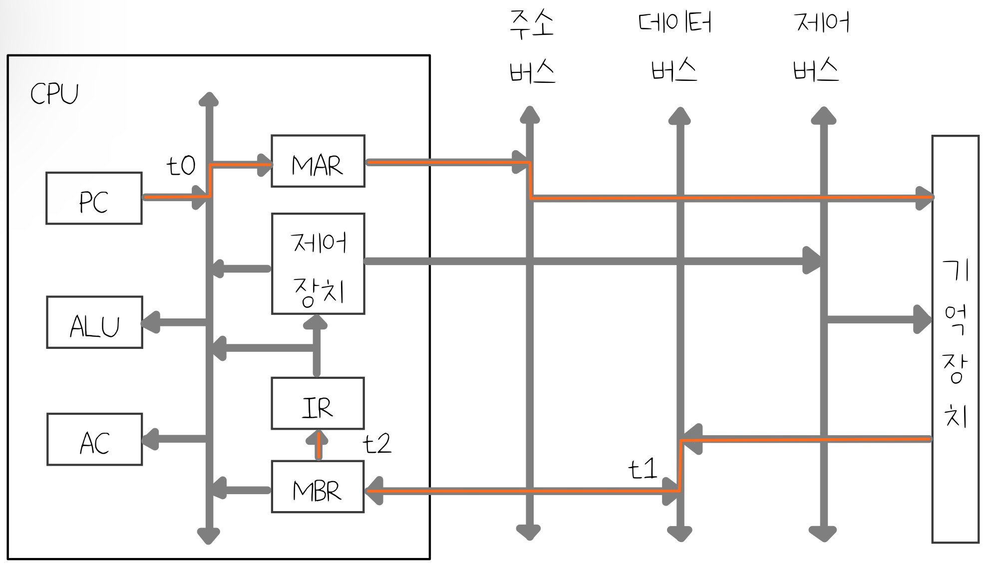 (2) CPU는 주기억장치에 저장된 프로그램 명렁어와 데이터를 읽고 처리한 후 다시 주기억장치로 보내 저장한다.