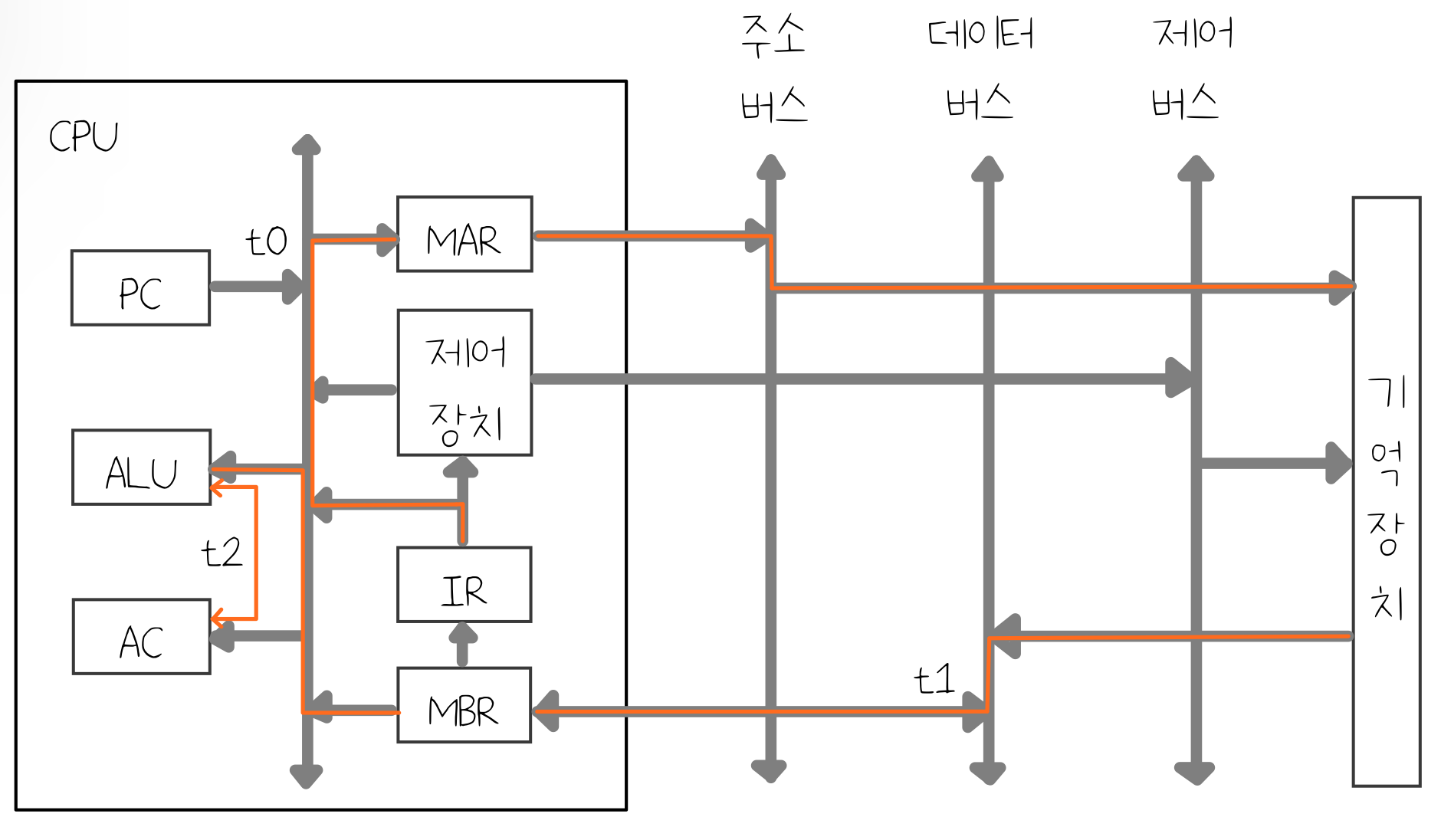 - MBR (메모리 버퍼 레지스터) : 주기억장치의 내용을 임시로 저장하는 역할